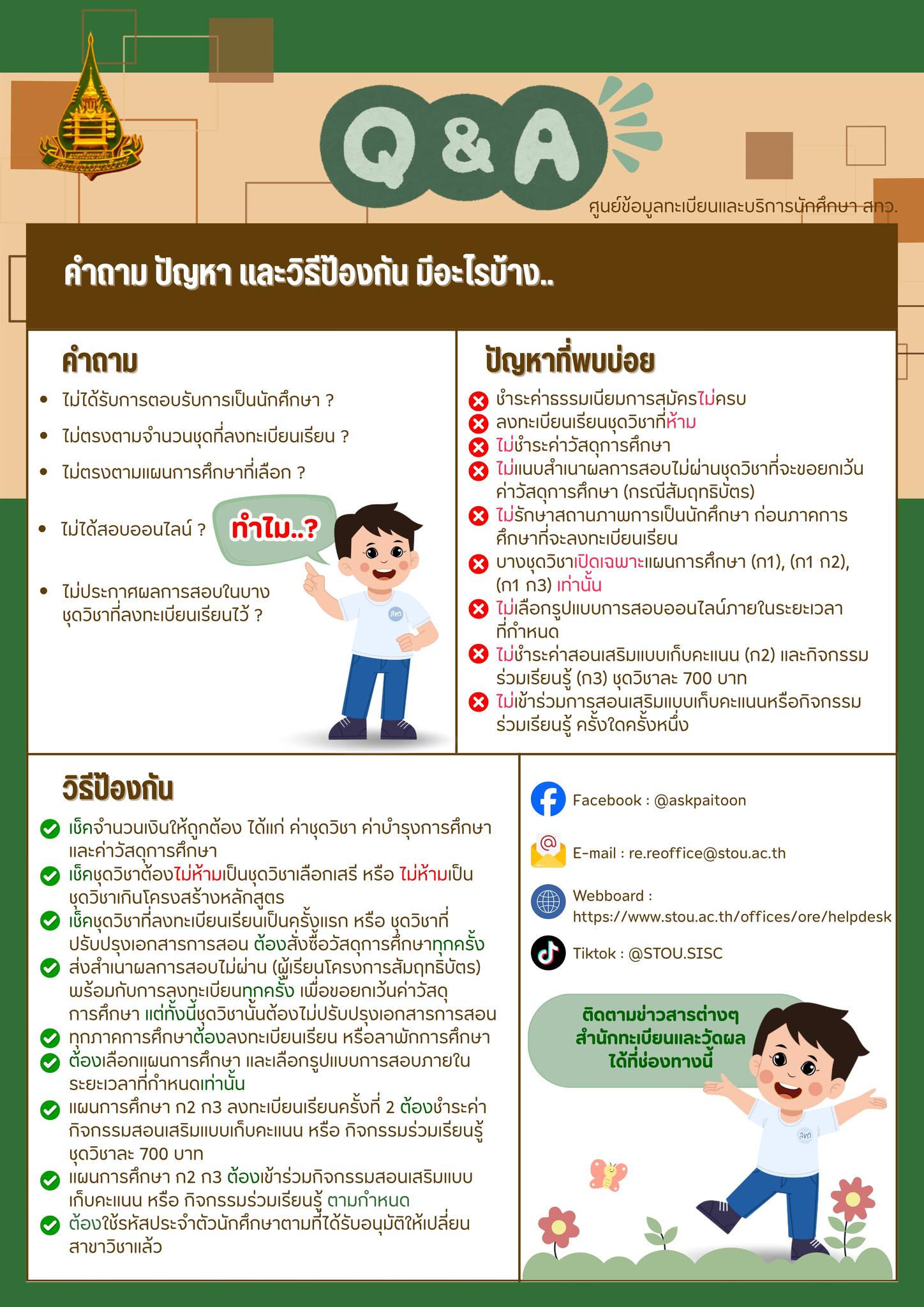 💐การลงทะเบียนเรียนกับมสธ. มีประเด็นอะไรบ้าง💐คำถามที่สงสัย⁉️ ปัญหาที่พบ⁉️ วิธีป้อง⁉️ และช่องทางในการติดต่อ⁉️👁👁ศูนย์ข้อมูลทะเบียนและบริการนักศึกษามีคำตอบ👁👁🌎FB:@askpaitoon🌍Email: re.reoffice@stou.ac.th🌏กระดานสนทนา : https://reg.stou.ac.th/helpdesk/🚦หมายเหตุ🚦 นักศึกษาสามารถศึกษารายละเอียดเพิ่มเติมได้จากคู่มือการลงทะเบียนเรียน ปีการศึกษา 2568 คลิกได้ที่นี่ https://reg.stou.ac.th/home/registration-handbook/