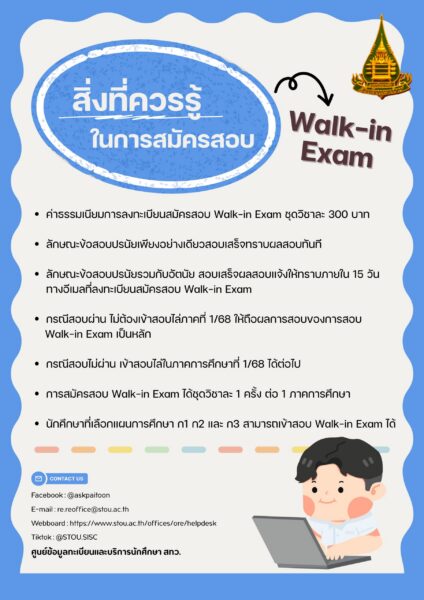 นักศึกษาที่สนใจสอบก่อน ผ่านก่อน ไม่ต้องเข้าสอบไล่ คลิกสมัคร(Walk-in Exam) ได้